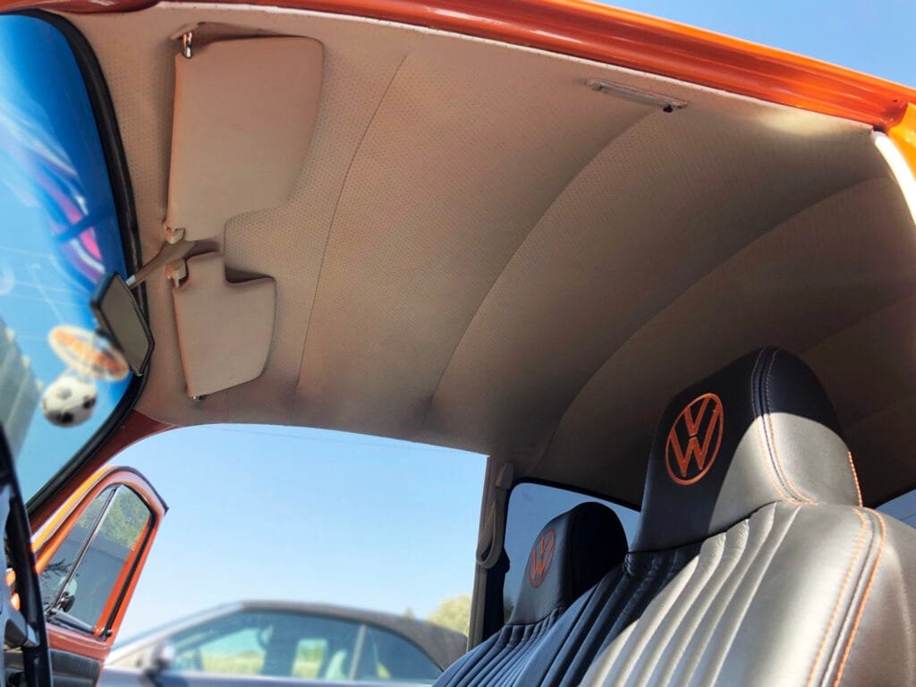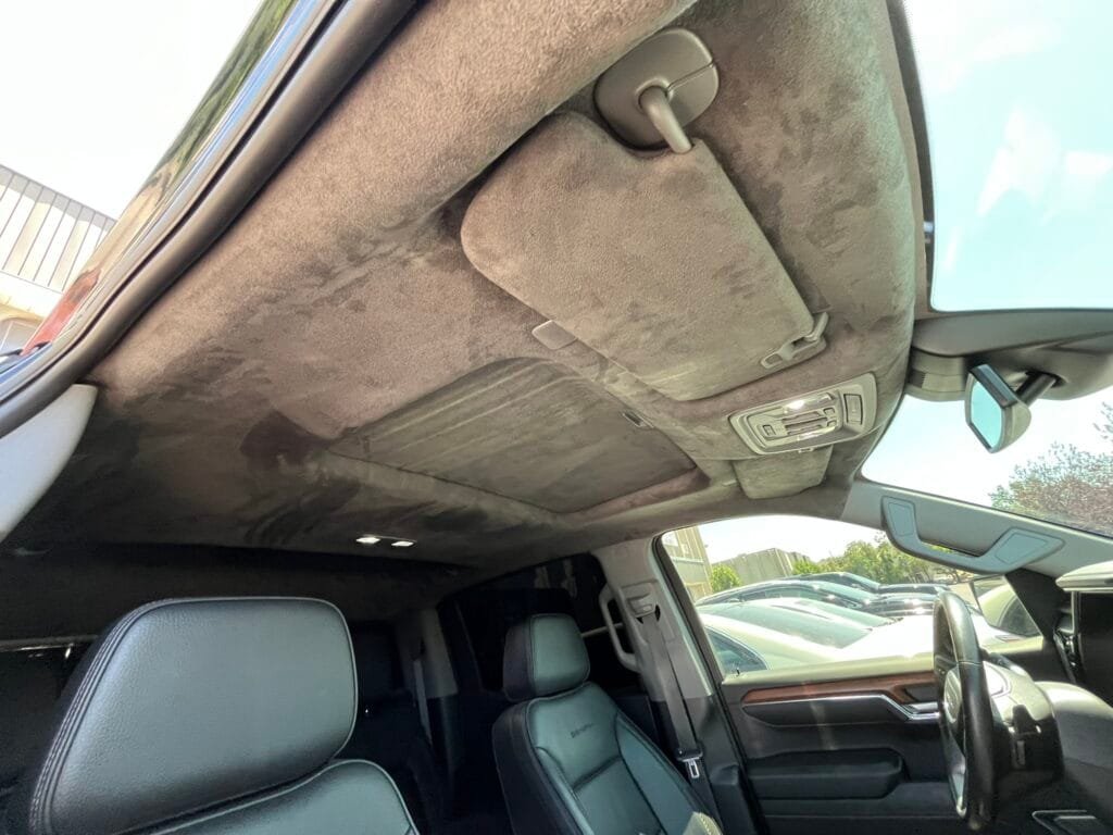 A sagging headliner can’t be fixed with spray glue or pins because the foam underneath has already deteriorated. The only long term solution is to replace the foam and fabric completely. Here’s what our repair process looks like: